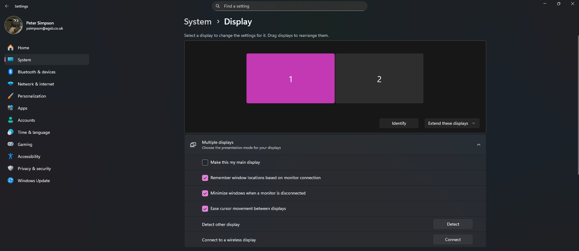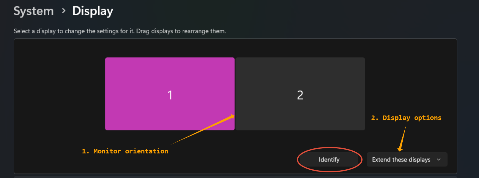 This section allows you to configure the orientation of your monitors - this is done by clicking and dragging each monitor (1, 2) etc. into position. For example in the above image Monitor 1 would be on the left of Monitor 2.